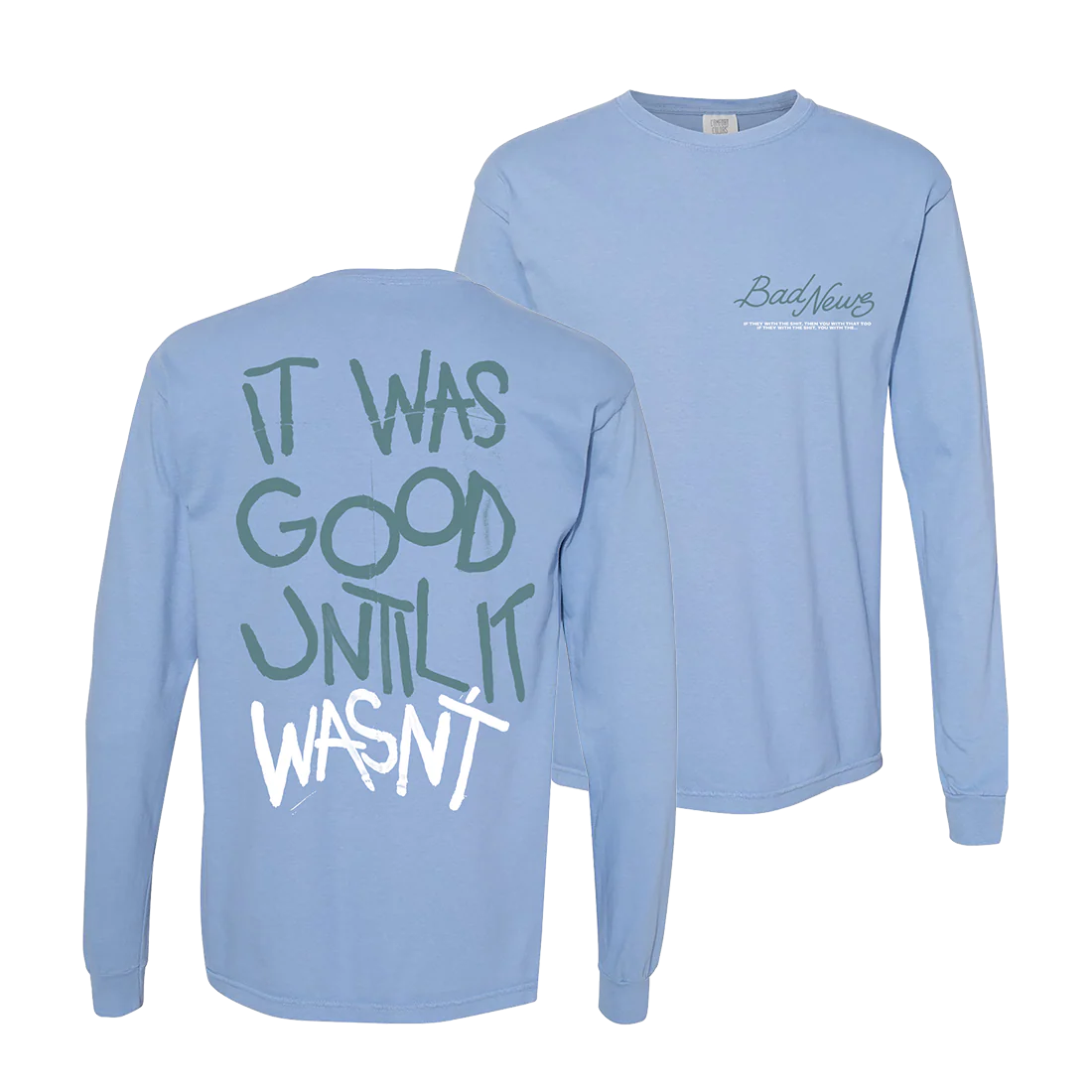 Bad News Longsleeve featuring lyrics from 'Bad News' on the front. The back features It Was Good Until It Wasn't.Â